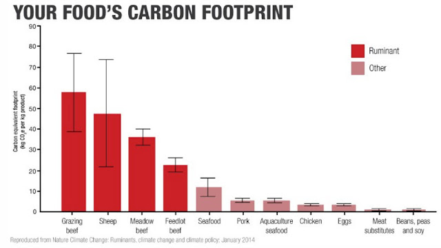 This is a simplification of course - here in the SF Bay Area, free-range cattle grazing provides an alternative land use to low-density sprawl in the hills, so I think that ranching has a positive climate impact. Still, the disparity speaks for itself.